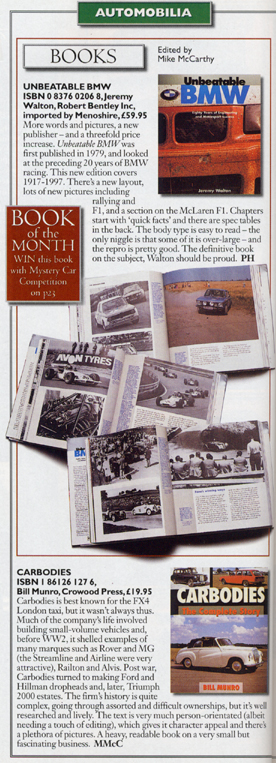 More words and pictures, a new publisher - and a threefold price increase. Unbeatable BMW was first published in 1979, and looked at the preceding 20 years of BMW racing. This new edition covers 1917-1997. There's a new layout, lots of new pictures including rallying and F1, and a section on the McLaren F1. Chapters start with 'quick' facts and there are spec tables in the back. The body type is easy to read - the only niggle is that some of it is over-large - and the repro is pretty good. The definitive book on the subject, Walton should be proud.