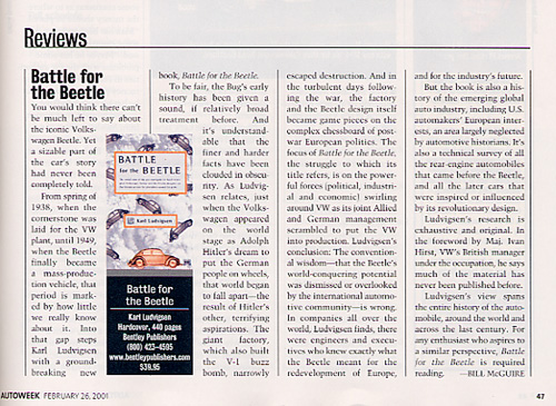 But the book is also a history of the emerging global auto industry, including U.S. automakers' European interests, an area largely neglected by automotive historians. It's also a technical survey of all the rear-engine automobiles that came before the Beetle, and all the later cars that were inspired or influenced by it's revolutionary design.